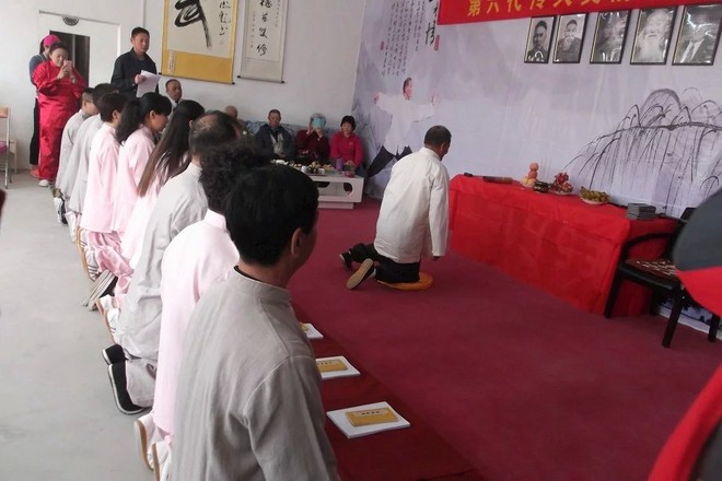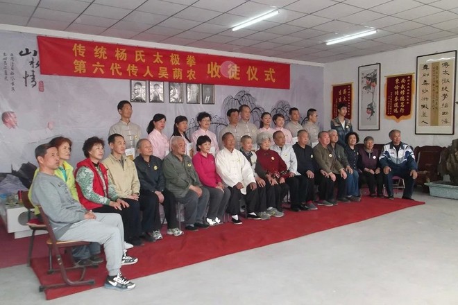 拳社演武厅正北面高悬“传统杨氏太极拳第六代传人吴荫农收徒仪式” 的红底条幅,下面供奉杨露蝉、杨健侯、杨澄甫、崔毅士、吉良晨几位先祖师肖像,香案上摆设香炉、供果,两侧嘉宾贺礼,书法字画,锦旗排列,庄严肃目。