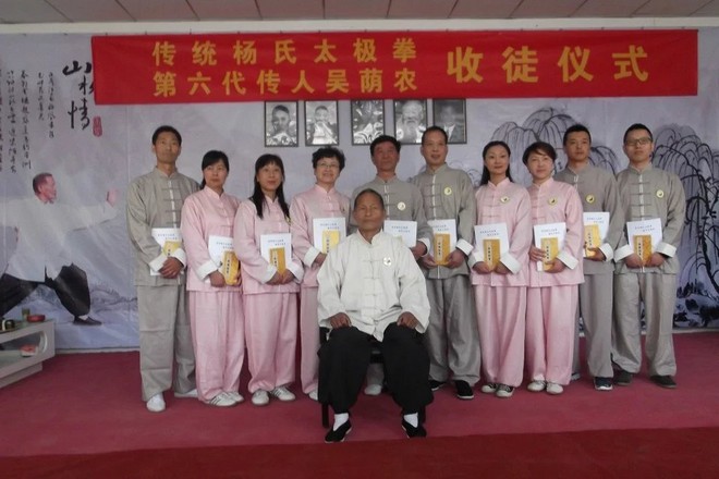 枪旗冉冉绿丛园,谷雨初晴绽桃蕊。坐落于平谷万亩桃园丛中的吴荫农太极拳社内,更是春意盎然,高朋满座,一派欢快热闹喜庆的气氛------“传统杨氏太极拳第六代传人吴荫农收徒仪式”,于2016年4月22日上午10时在此隆重举行。来自全国各地的十名弟子将拜在吴荫农先生门下,成为传统杨式太极拳第七代传人。(十名新弟子为:王兴义,李丽华,王贵林,张桃英,王渊慧,段宁,沈玲莉,欧阳震,赵小超,杨波。)